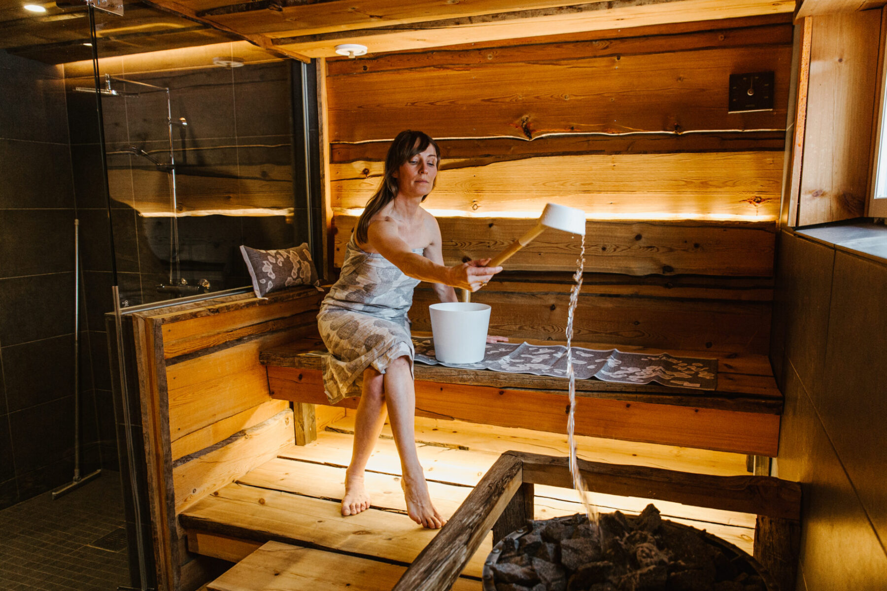 サウナを楽しむには、全身を洗うことから始まります。サウナに入る前にシャワーを浴びて、汚れや汗、化粧品などを落とすことで、ベンチを清潔に保ち、木材の寿命を延ばすことができます。